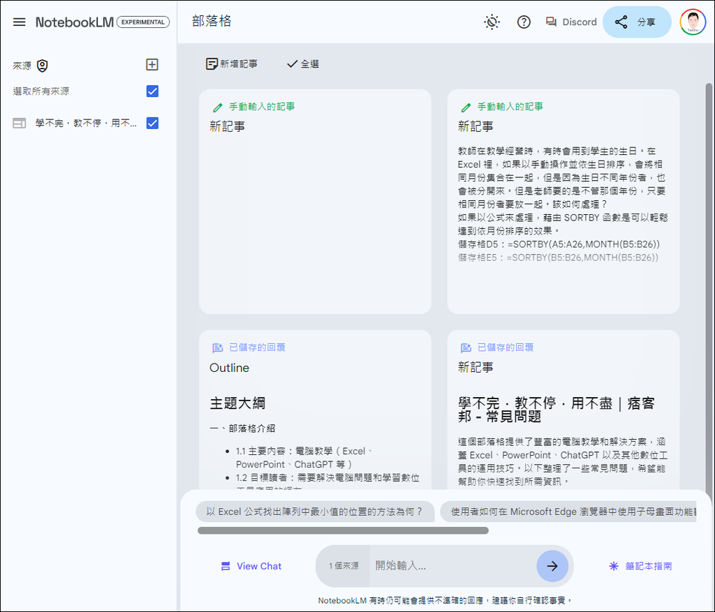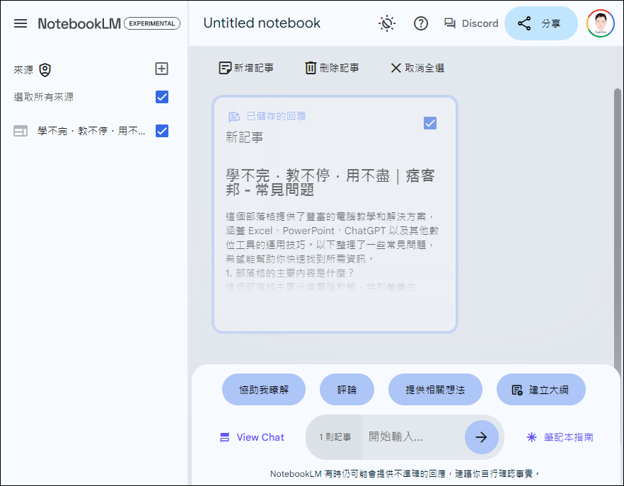無論師或生做筆記時,除了閱讀、筆記之外,你還會想要提問、整理、採究,這些都可以讓 AI 來協助。Google 推出筆記工具 NotebookLM 並且使用 Gemini 1.5 Pro,在台灣已經可以使用了!