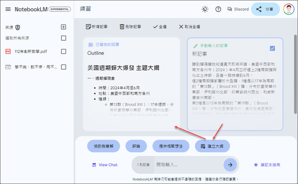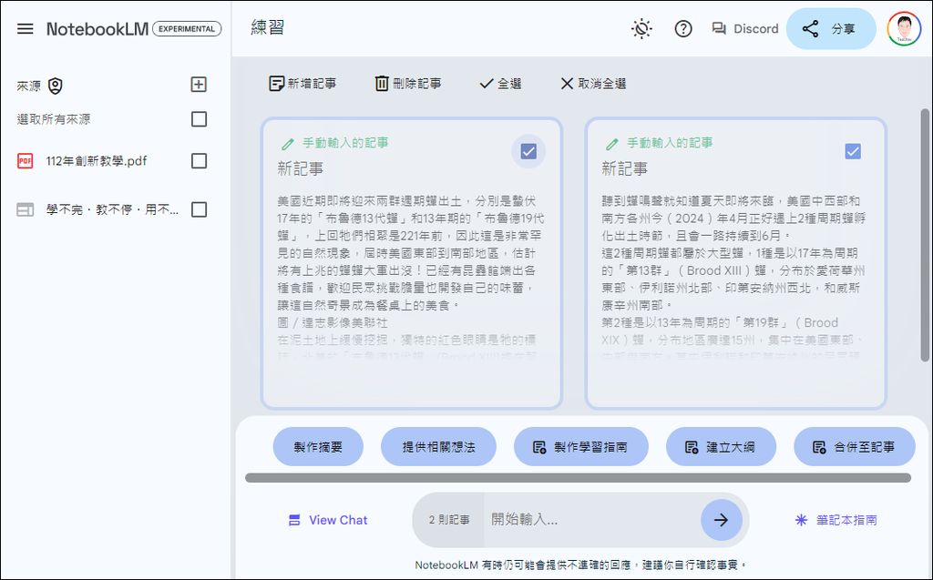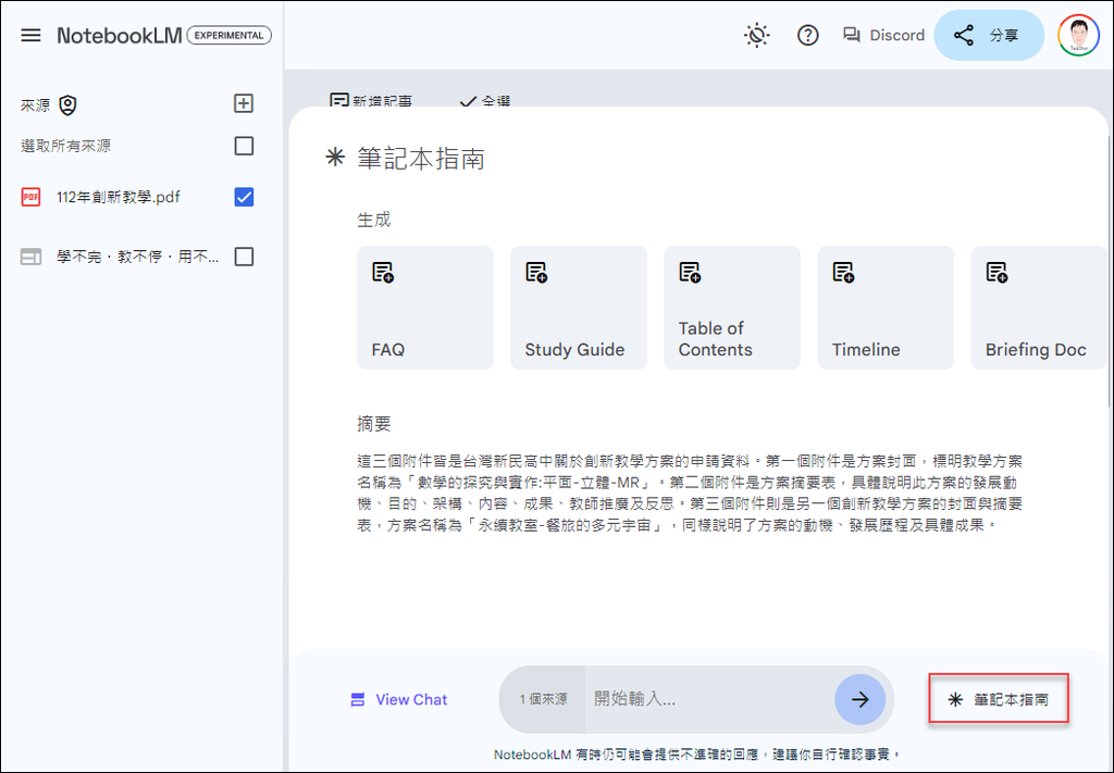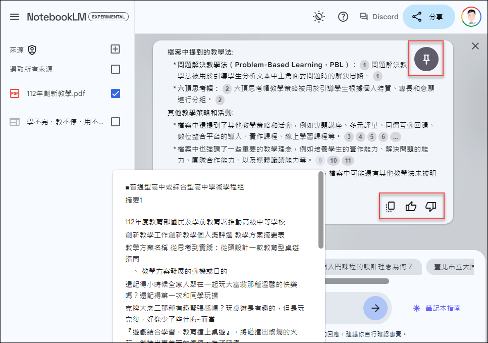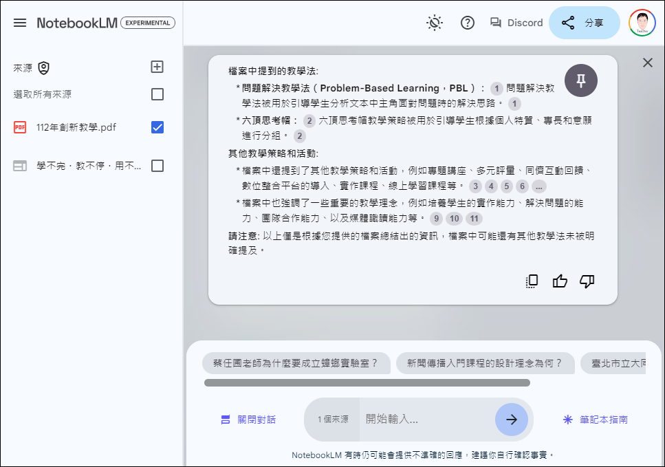 接著,我上傳了一個PDF檔,其中是112年教學卓越獎得獎的教案。目前資料源有二個,但是可以只勾選一個PDF檔。