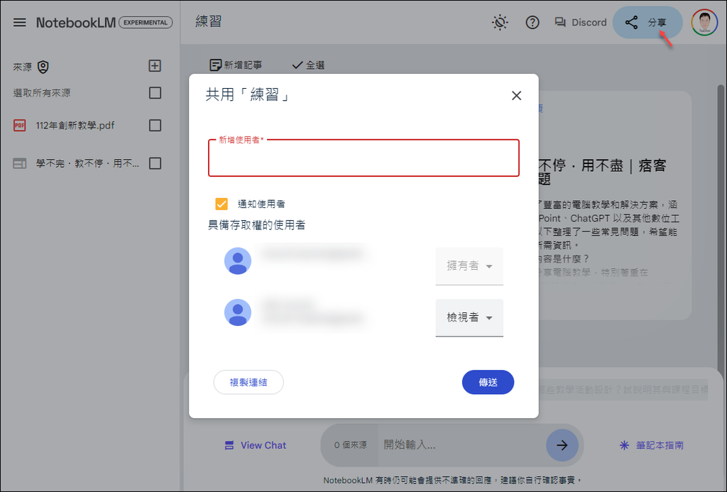 * NotebookLM 的分享功能,有助於教師或學生進行協作或共備。