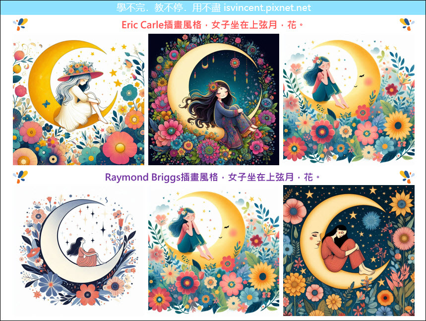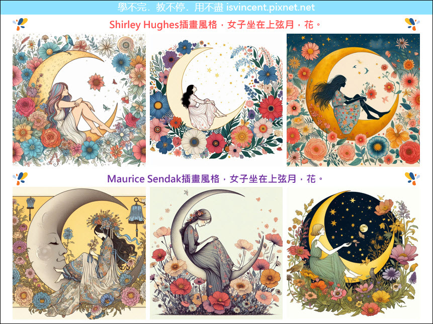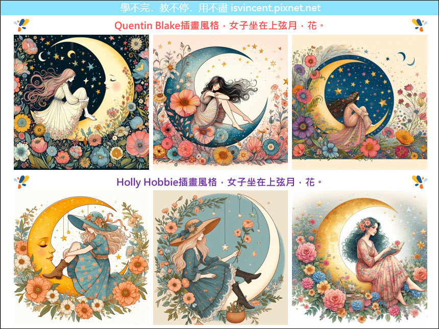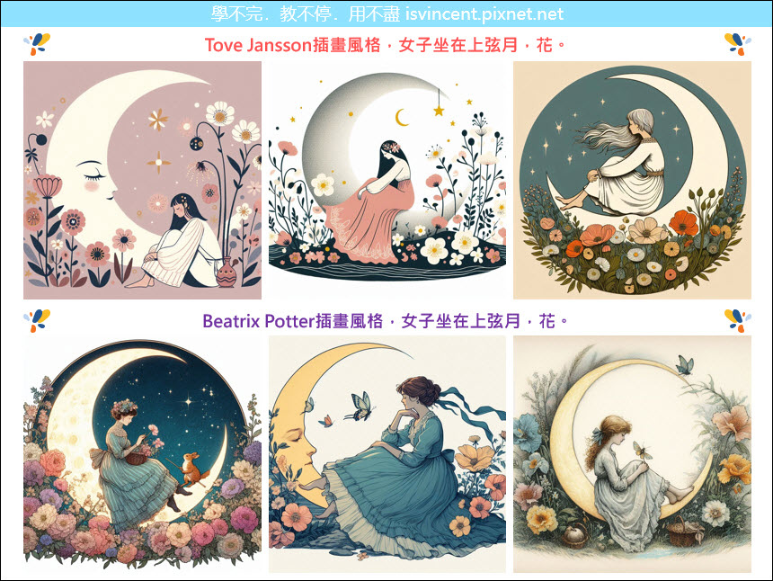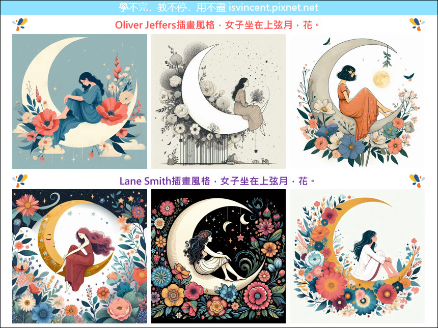 實際以 Microsoft Bing Image Creator 來實測,例如:XXXX插畫風格,女子坐在上弦月,花。