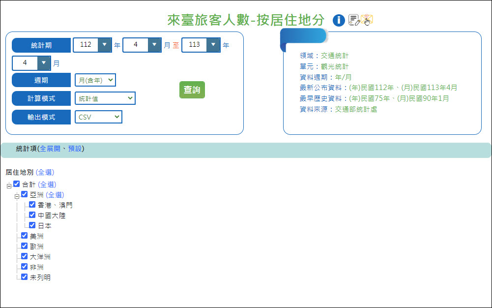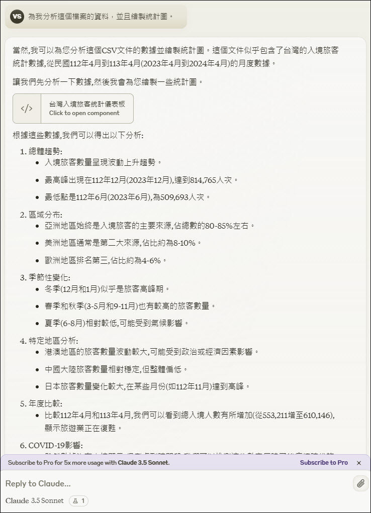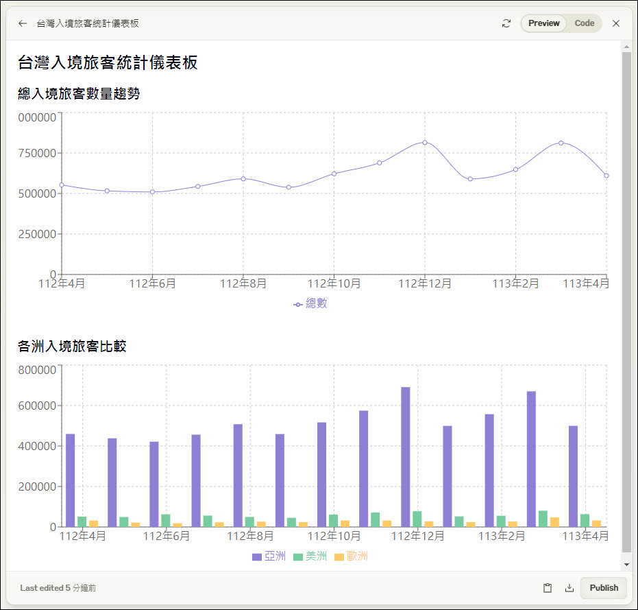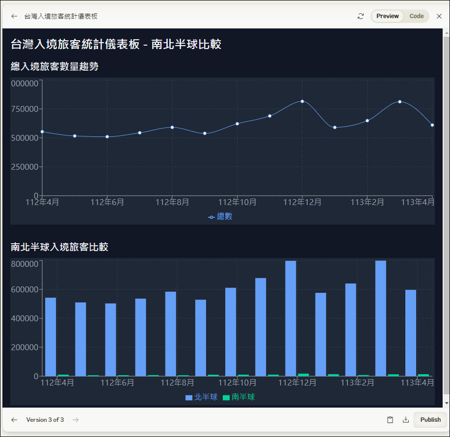 點選:台灣入境旅客統計儀表板,在視窗左側會立即顯示圖表的部分。