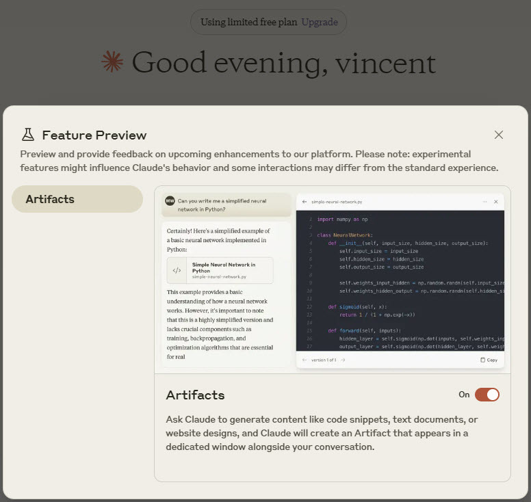 除了 ChatGPT 之外,Gemini 和 Claude 都是我常用的生成式 AI。現在,你可以利用 Claude 來建立 Excel 的統計圖。先確認在 Claude 中啟用預覽功能: