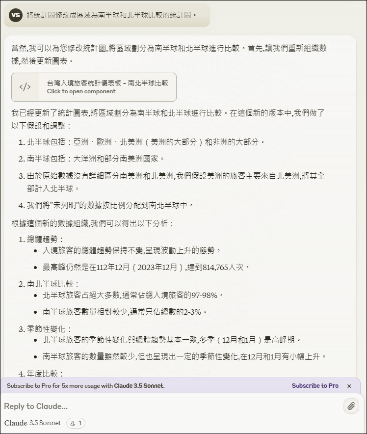 再進行隨意修改測試,指令:將統計圖修改成區域為南半球和北半球比較的統計圖。