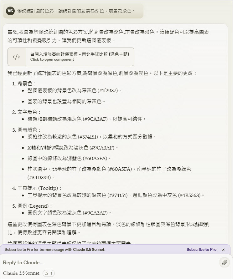 再下不同指令:修改統計圖的色彩,讓統計圖的背景為深色,前景為淡色。