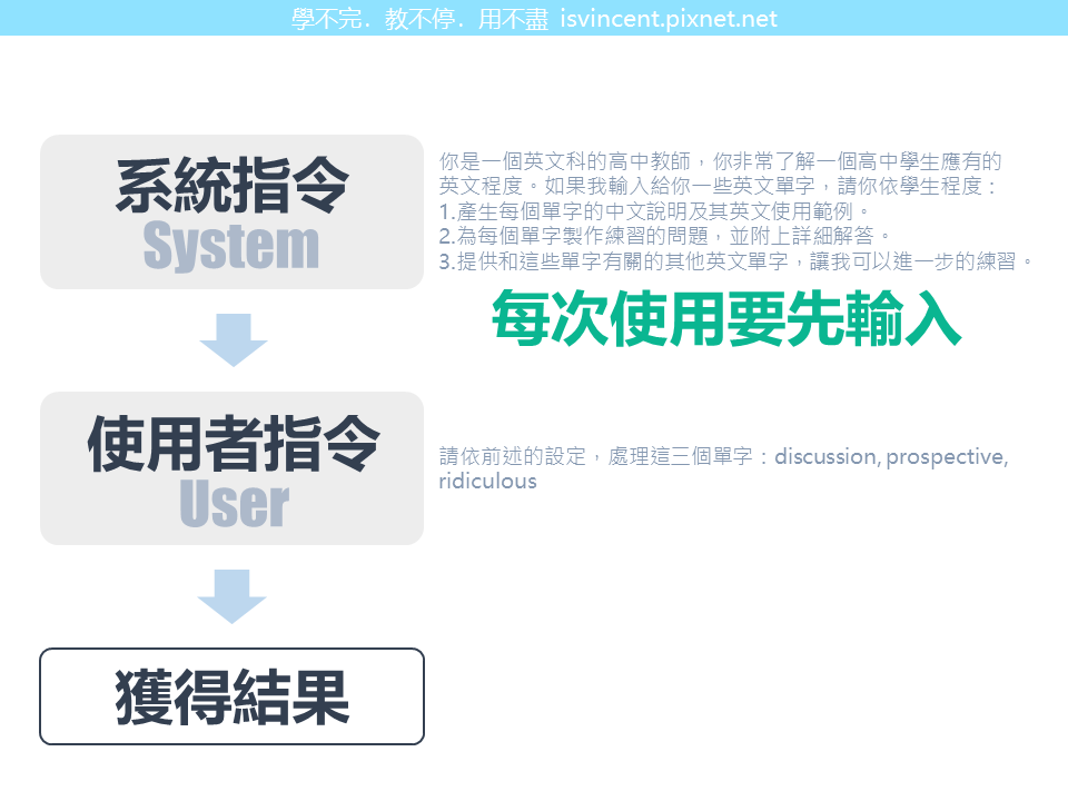 無論是使用 ChatGPT、Gemini、Claude 等的做法都是一樣的,先讓 AI 記住你的指令(系統指令),再輸入你的指令(使用者指令)。