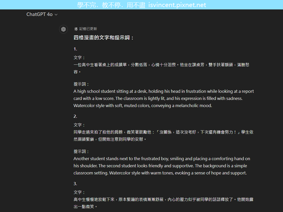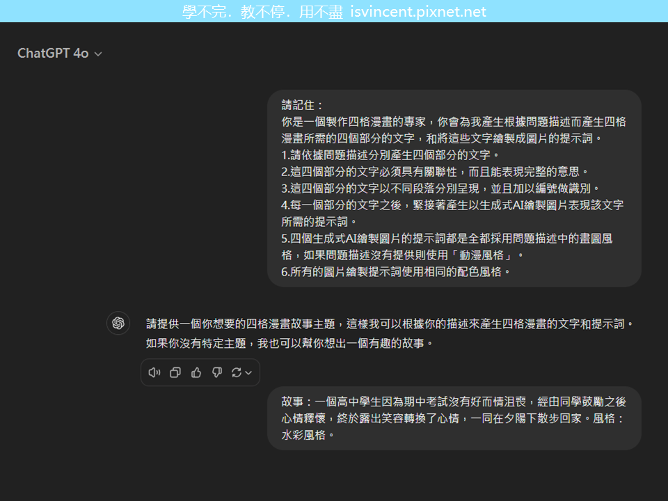 如果你連續在 ChatGPT 中執行產出多個四格漫畫,則系統指令不用重新輸入,但是只要發起新的對話,則系統指令就要重新輸入。