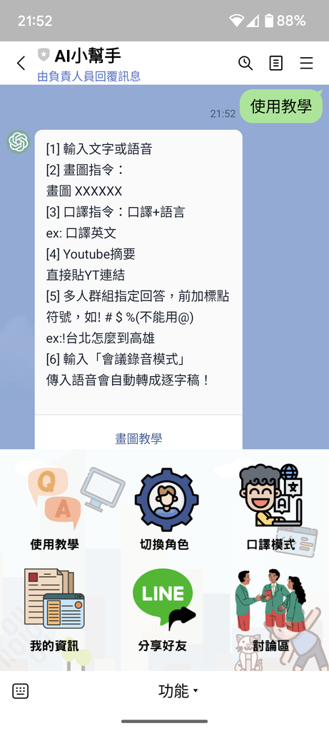 Line AI 小幫手是免費的工具,也可利用畫圖指令來繪製圖片。關於 AI 小幫手,先參考: