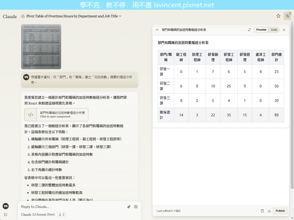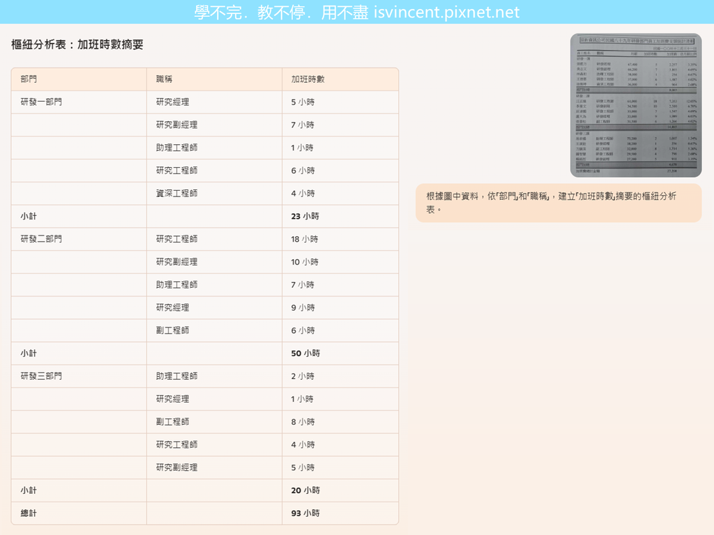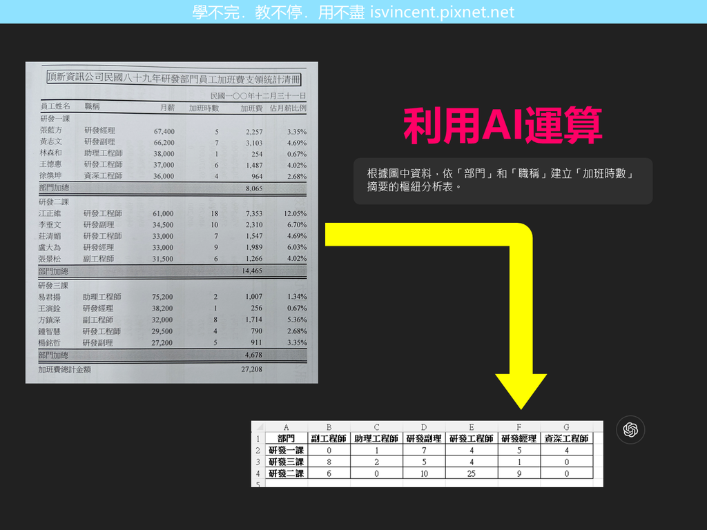 但是如果將圖片上方內容,丟給 ChatGPT 處理,提示詞:根據圖中資料,依「部門」和「職稱」建立「加班時數」摘要的樞紐分析表,並產生檔案供我下載。