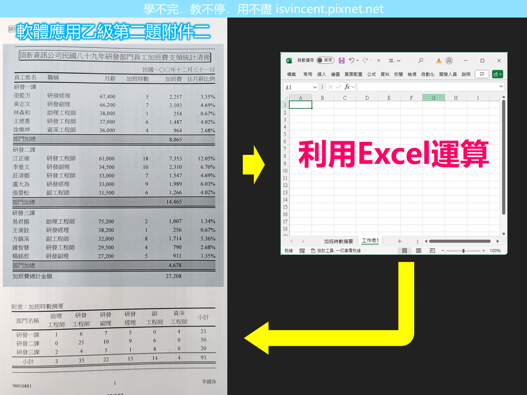 以下的考題是根據軟體應用乙級第二題附件二教材所拍攝的圖片,如果依據上圖要做成下圖,必須經由 Excel 的公式處理,或是操作樞紐分析表才能得到結果。