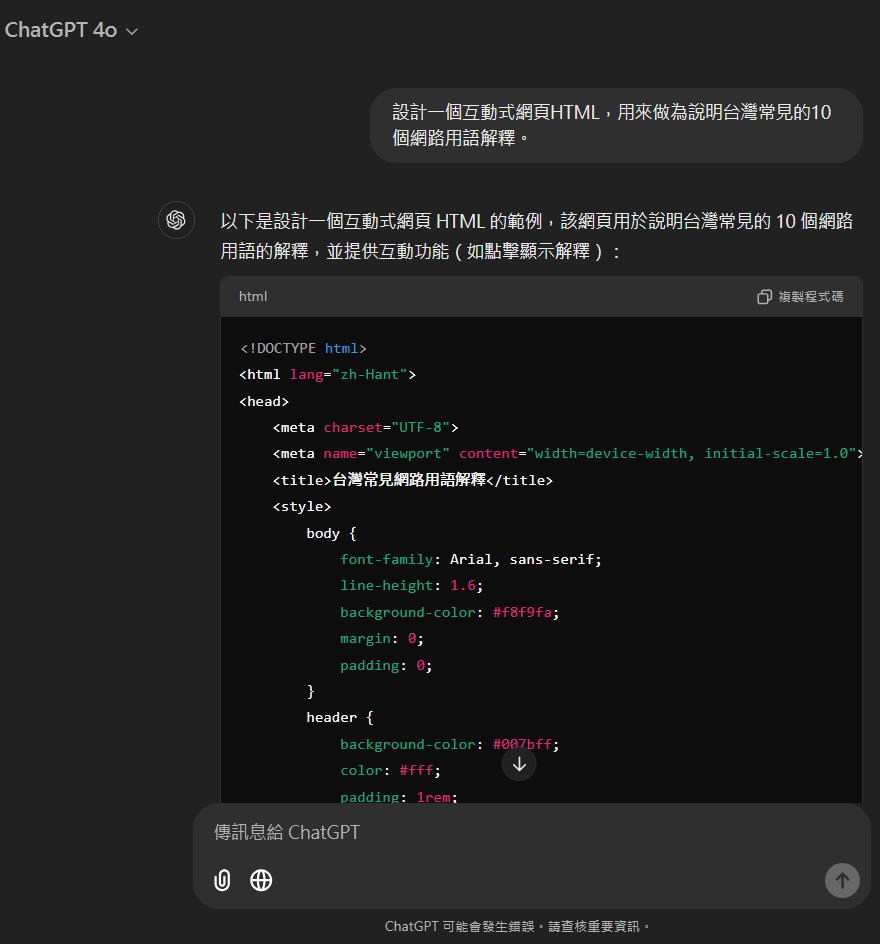 ChatGPT 會傳回一個 HMTL 程式碼,複製這個程式碼。貼至記事本中,再另存為 .html 檔案。