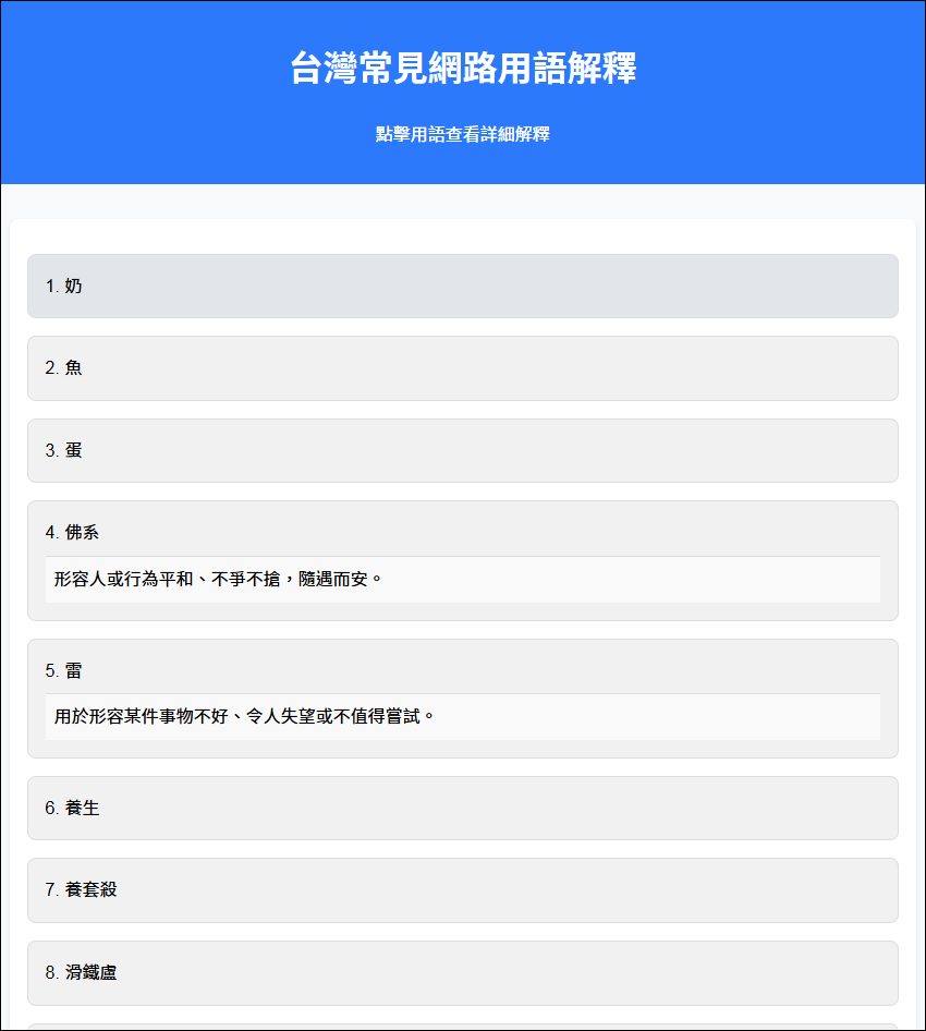 提示詞:設計一個互動式網頁HTML,用來做為說明台灣常見的10個網路用語解釋。