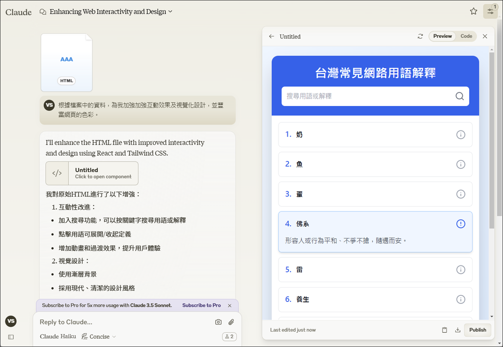 結果如下,Claude 除了強化原 HTML 檔案中的內容,最重要的是在此就可以利用分享機制,就可以將 HTML 程式在網頁上播放。