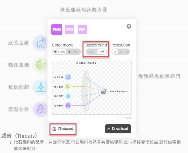 除了點選:Download,下載成 PNG 圖檔之外,如果要將圖片結合 Canva 使用,在下載圖片的狀態下,點選:PNG,再點選:Background 為 Off,即設定透明圖片。