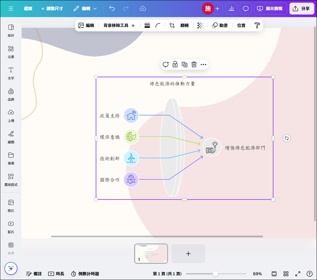 然後,在 Canva 的簡報投影片中,按 Ctrl+V 鍵,可以貼上這個圖片。這樣就可以無縫接軌。(但是內容細節無法修改)