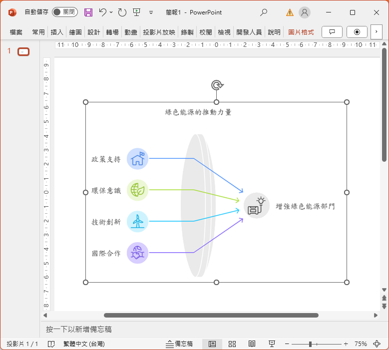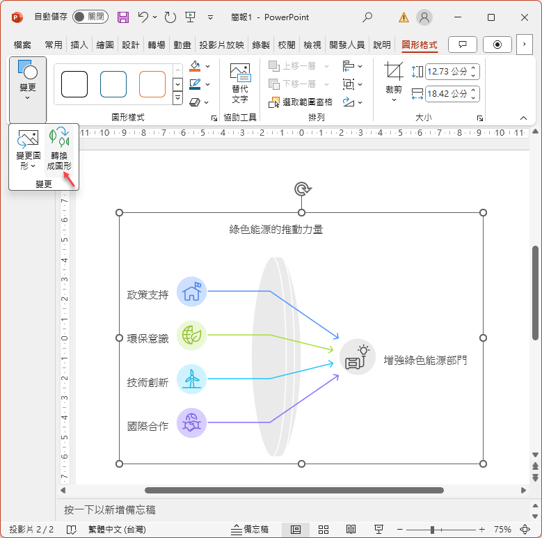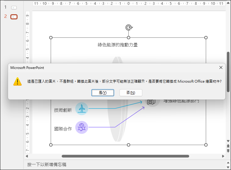 在 PowerPoint 的投影片插入這個圖片。然後,在「圖形格式」選單中選取「轉換成圖形」,或是按 Ctrl+Shfit+G 鍵。(取消群組)