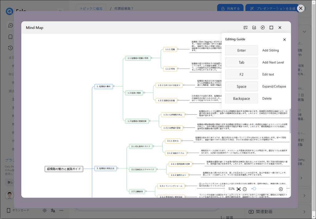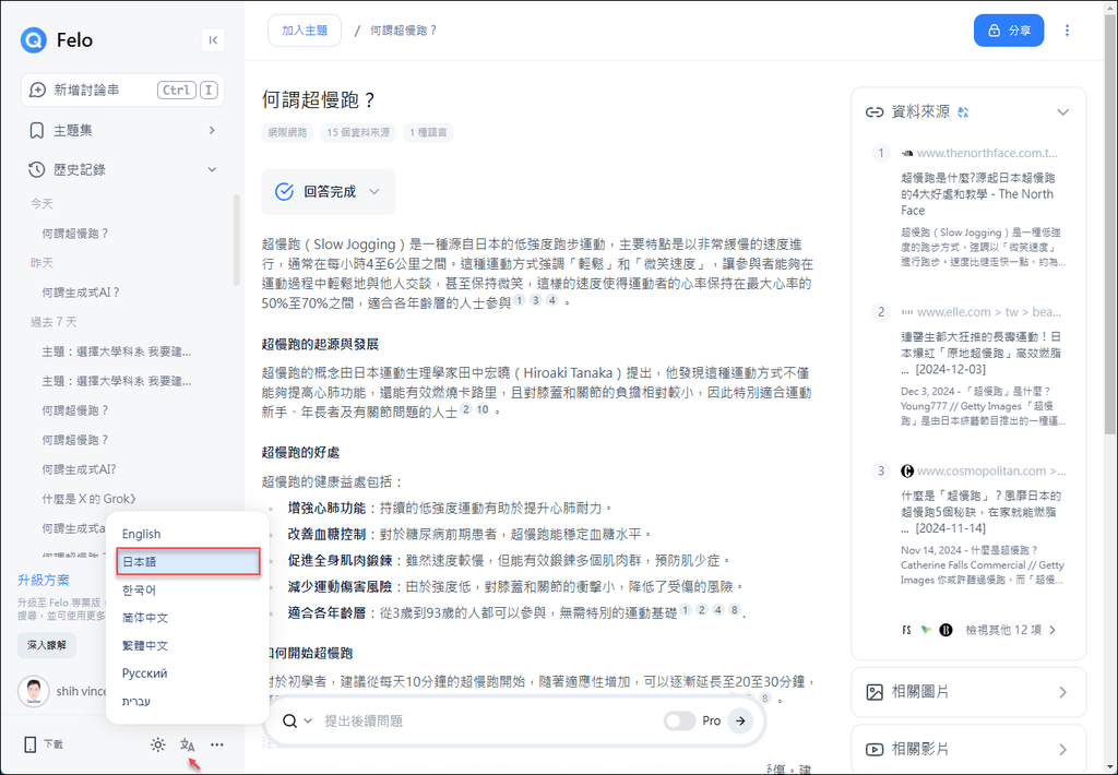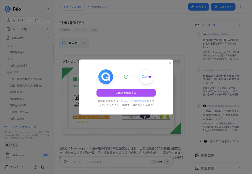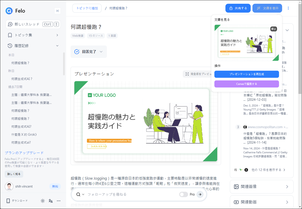 Felo AI 在產生答案時,除了會提供資料來源,也提供圖片和影片的搜尋結果,而還會幫你產生心智圖之外,最近如果切換至日本語時,可以為你將 AI 產生結果做成 PowerPoint 檔,也能讓你在 Canva 中使用。