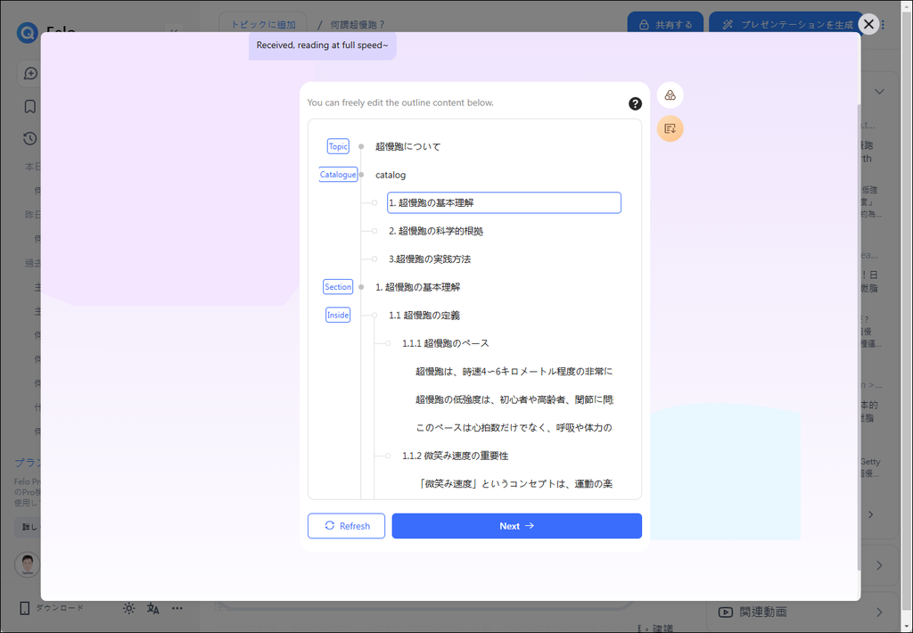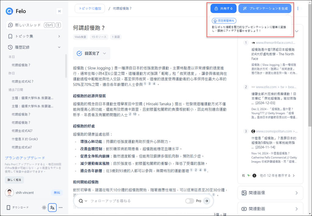 你會看到右上角顯示了不同的內容,這是個期間限定的功能,Felo可以為你製作簡報。點選這個按鈕。