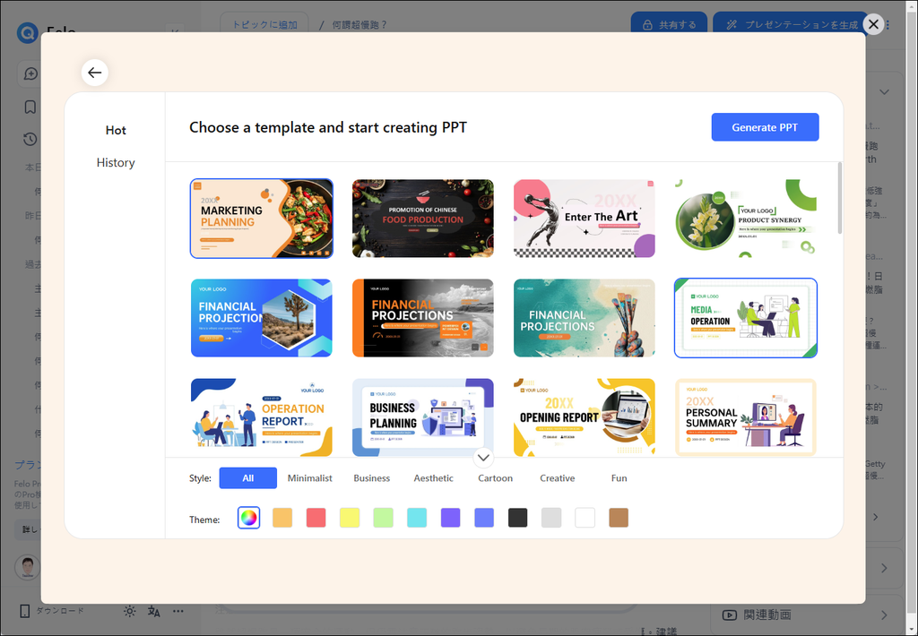 點選「Next→」,再挑選一個模版,並且點選右上角「Generate PPT」,Felo 會開始製作簡報。