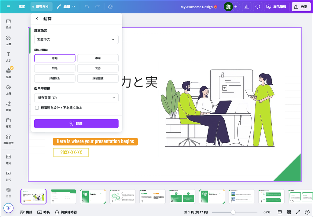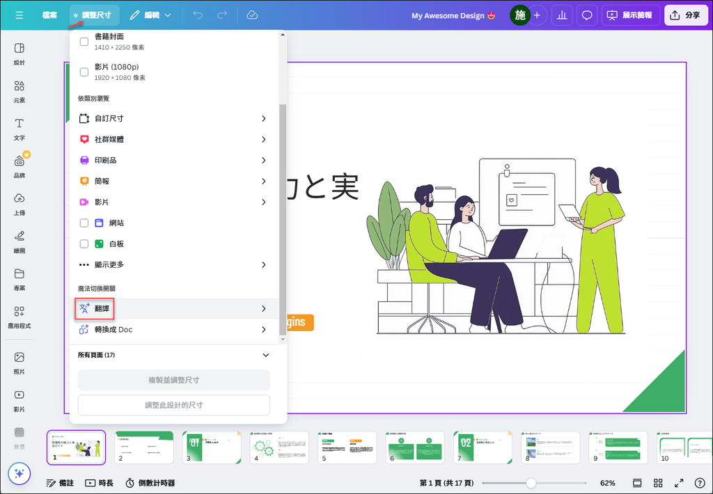 如果你想要將日文內容轉換為繁體中文,可以藉由 Canva 的 AI 翻譯功能來完成。只要選取:調整尺寸,再選取:翻譯。