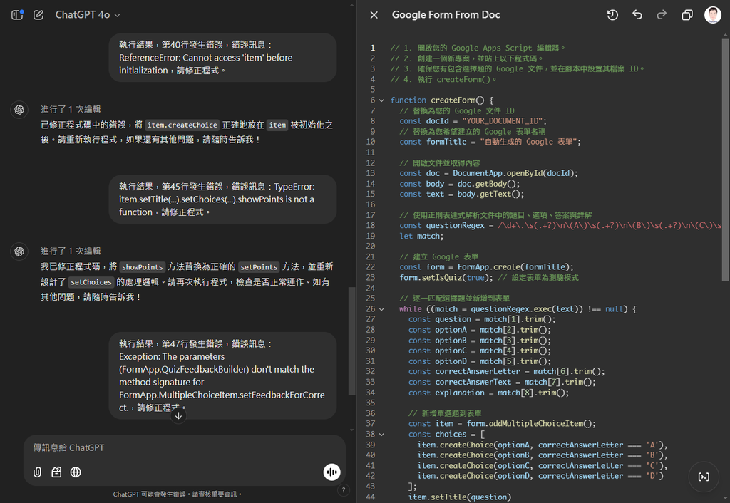請 ChatGPT 產生 Google Apps Script 程式碼,提示詞: