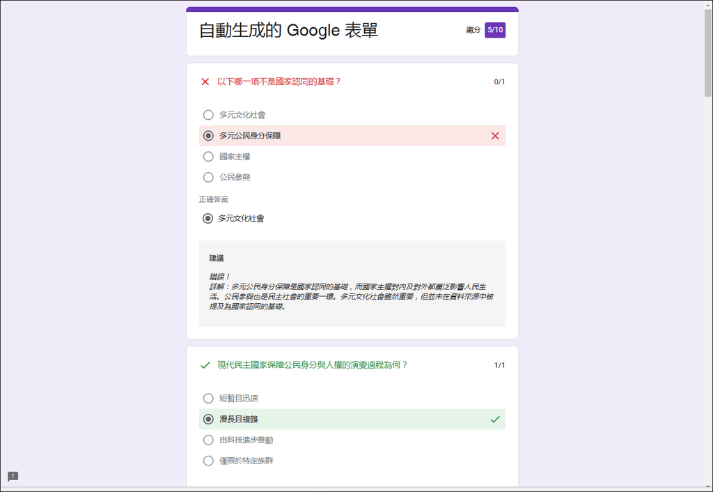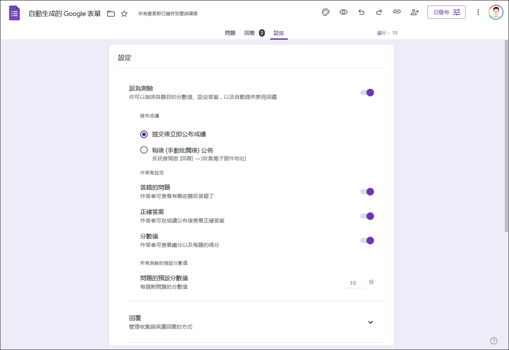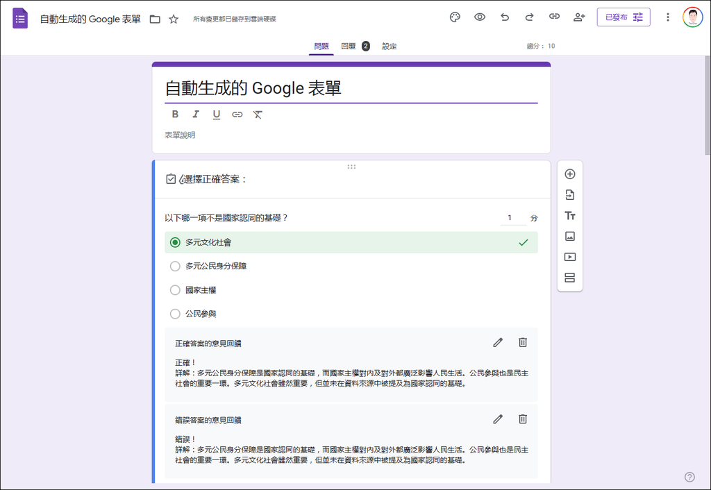 執行程式碼所產生的 Google 測驗表單如下,已有題目和設定答案及詳解。