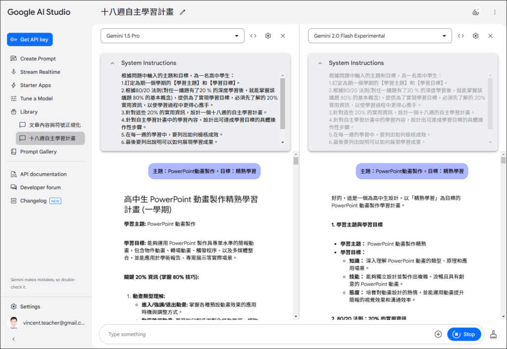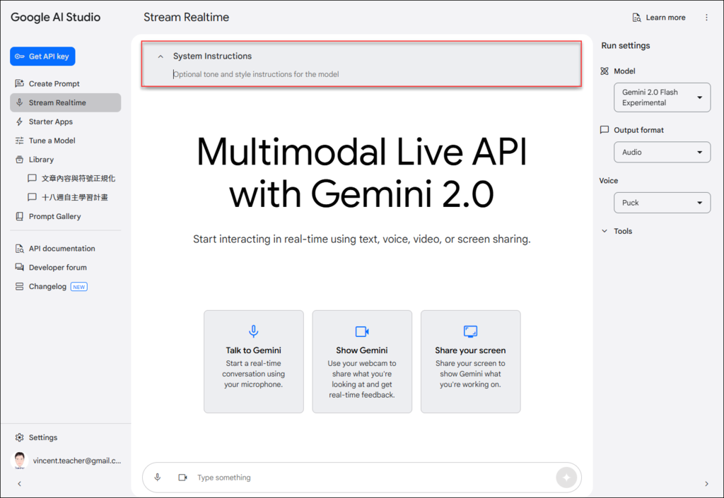 而在 Google AI Studio(https://aistudio.google.com/)提供了一些和 Gemini 不同的使用感受。例如,可以使用系統指令的設定。在介面中可以輸入「系統指令(System Instructions)」,使用者輸入問題時,會根據系統的設定來回覆。