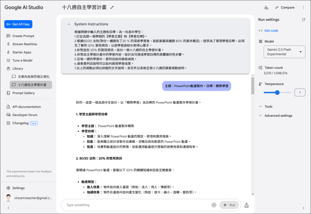 本例目前 Model 設定為「Gemini 2.0 Flash Experimental」,Temperature 設定為「1」。