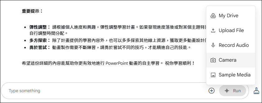 在此可以上傳的檔案也可含各種檔案格式:雲端硬碟文件、電腦上的檔案、錄音、錄影,和 Google 提供的範例圖片。
