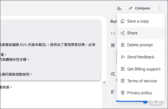 Google AI Studio 讓你可以在雲端上儲存目前的狀態,還可以讓你做不同版本的比較: