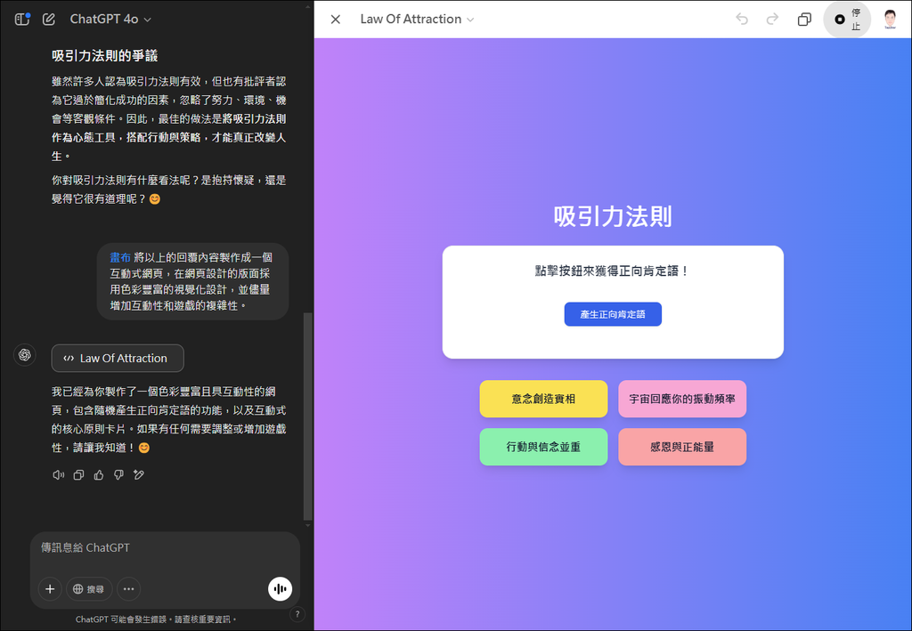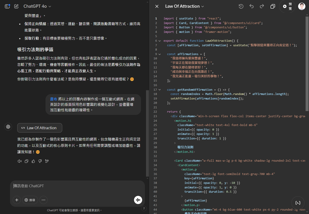 選擇「畫布」模式,輸入提示詞:將以上的回覆內容製作成一個互動式網頁,在網頁設計的版面採用色彩豐富的視覺化設計,並儘量增加互動性和遊戲的複雜性。