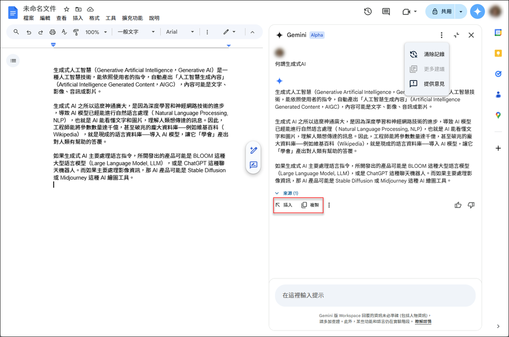 在 Google 文件中點選右上角的「向 Gemini 提問」圖示,即可開啟 Gemini 的對話窗格。在此可提問,Gemini 會回答你的問題,你可以將結果直接插入文件中,也可複製到其他地方使用。