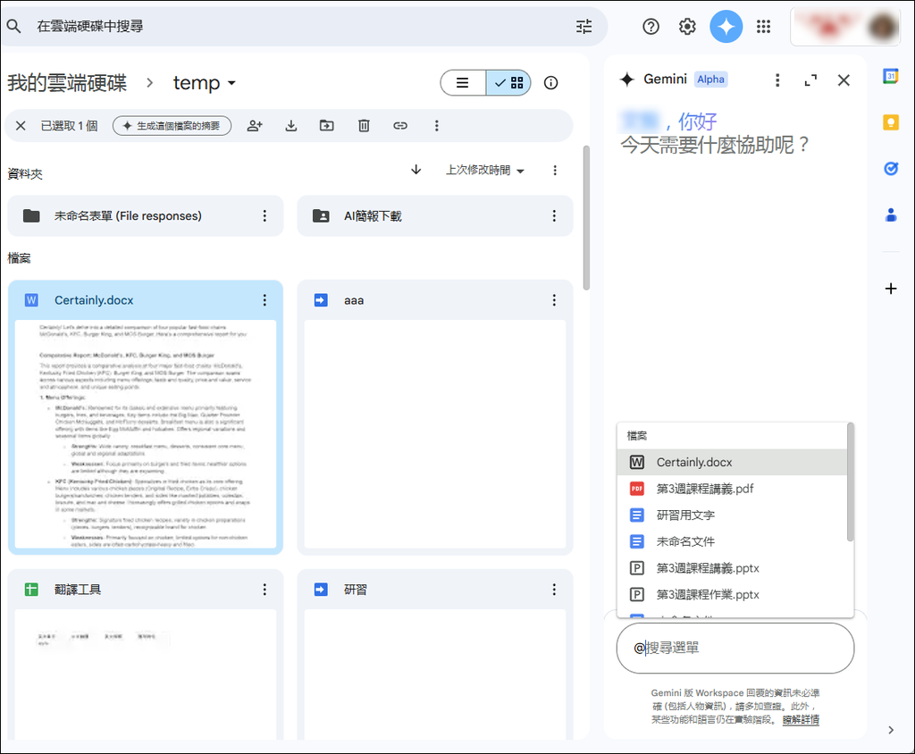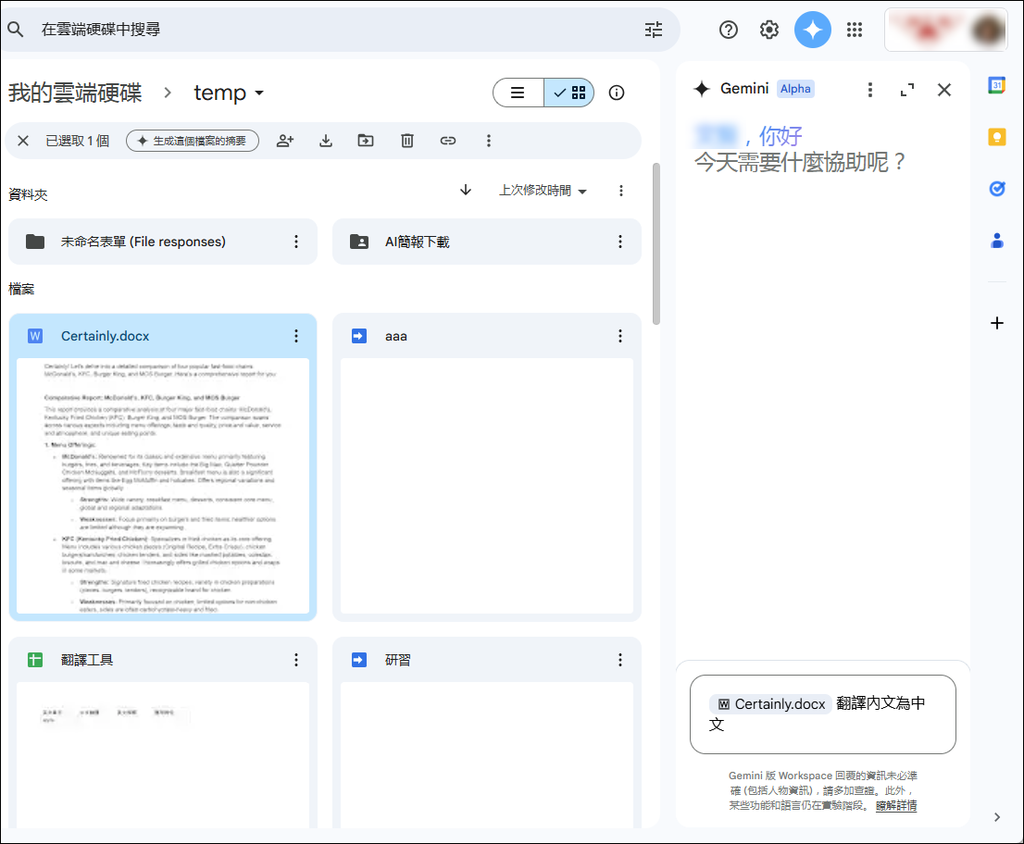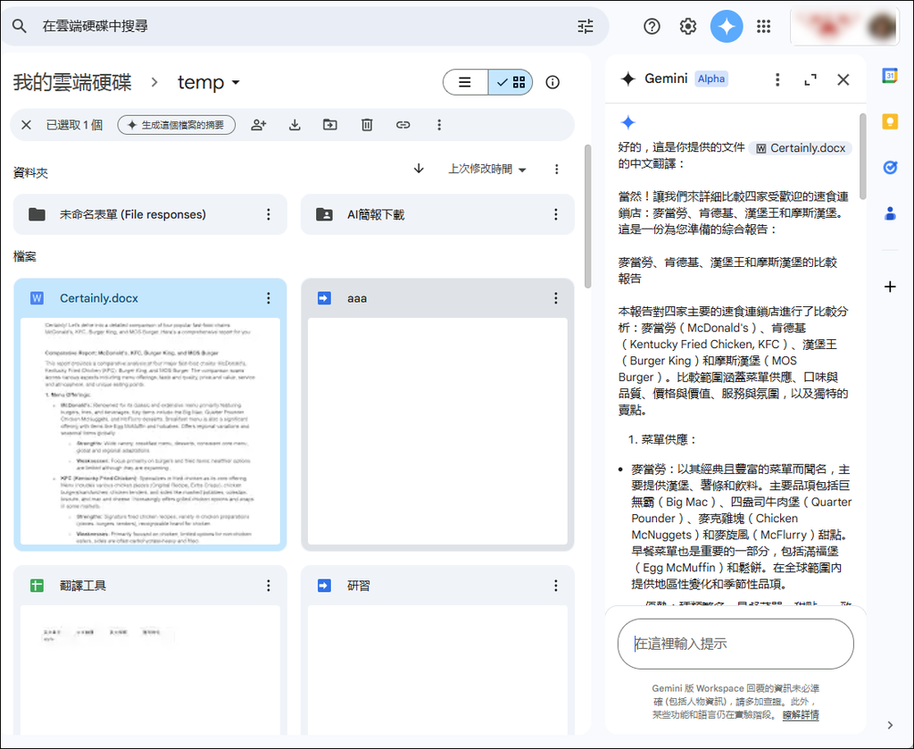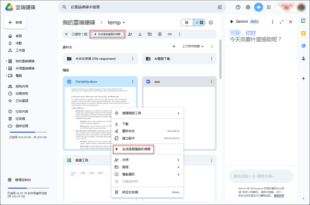 例如,在 Google 雲端硬碟中一個檔案上按右鍵,再點選「生成這個檔案的摘要」。不過,目前尚未支援中文。