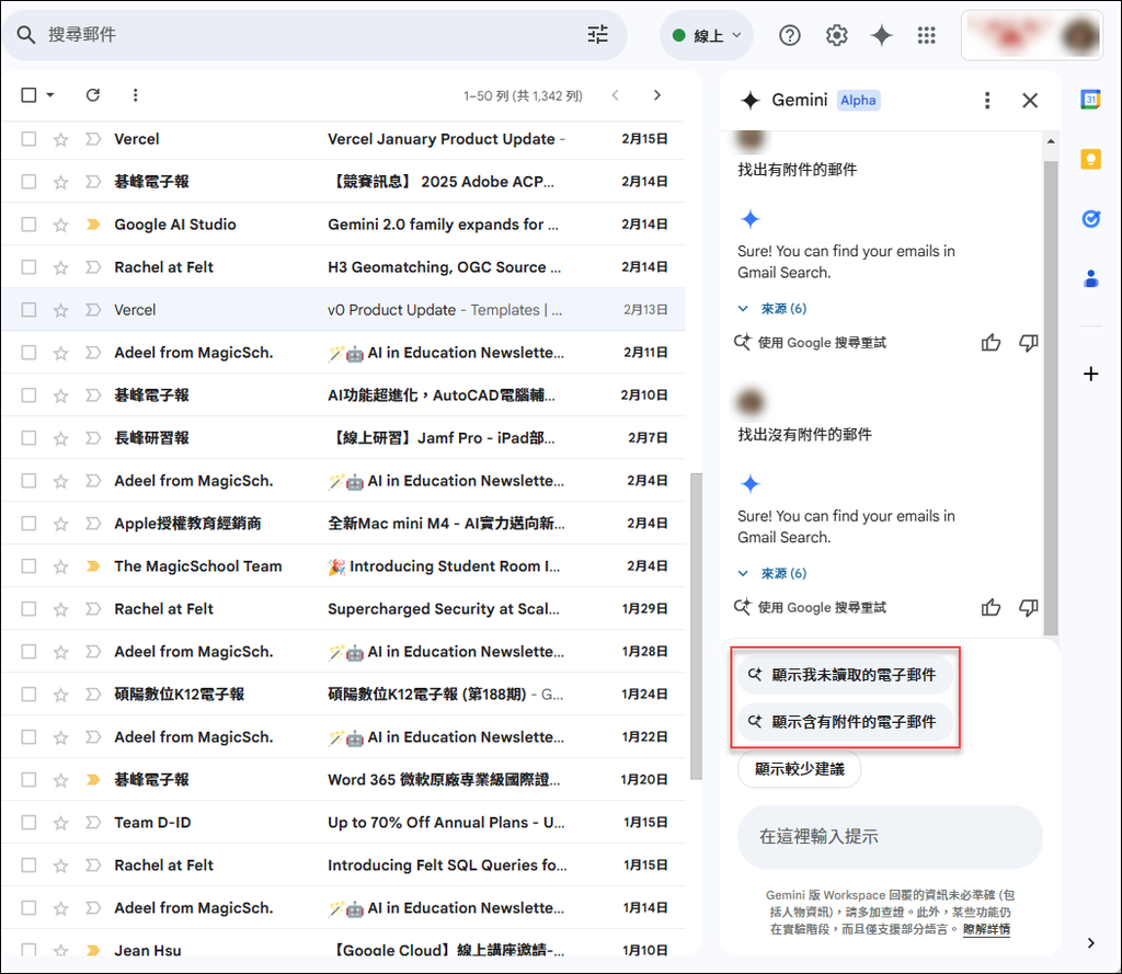 如果你的帳號是 Gemini Advanced,則 Google 雲端硬碟、Google 文件、Google 試算表、Gmail等,也都會陸續融入 Gemini 了。