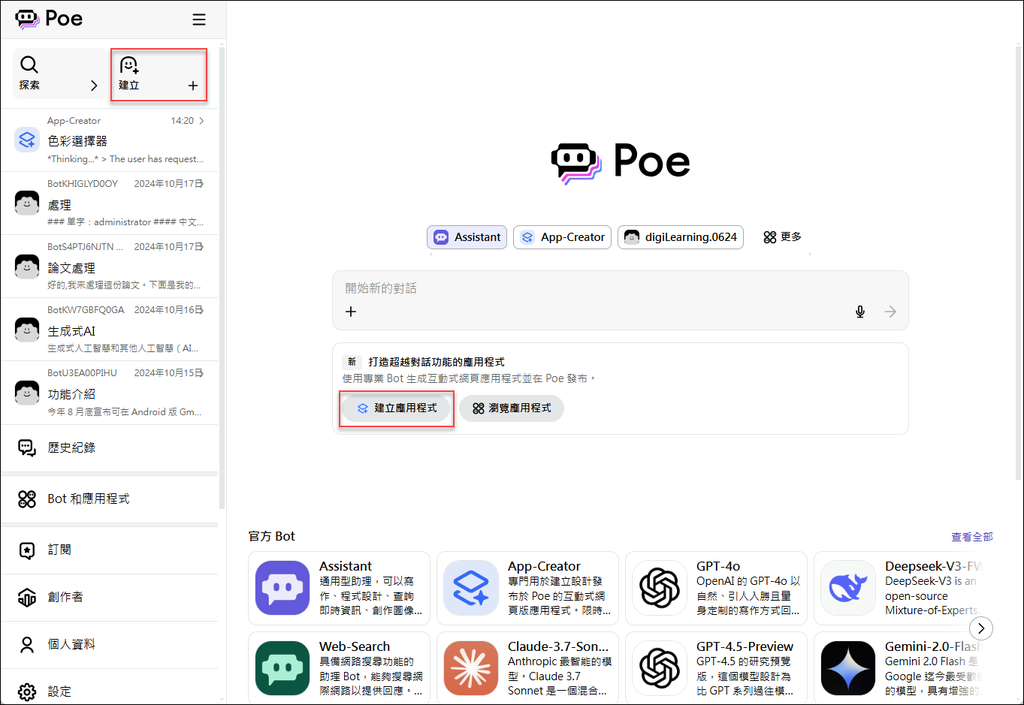 在 Poe 的左側邊欄位中點選:建立。