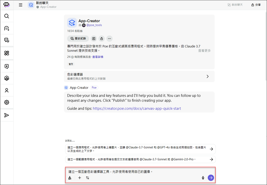 先參考 Poe 提供的說明:https://creator.poe.com/docs/canvas-app-quick-start