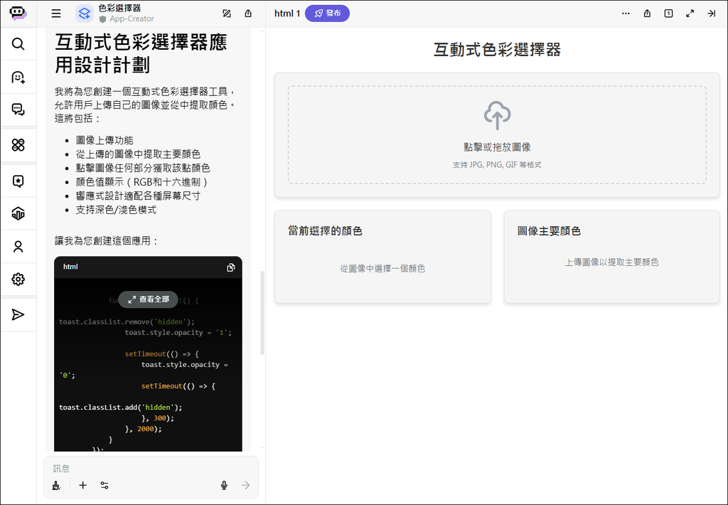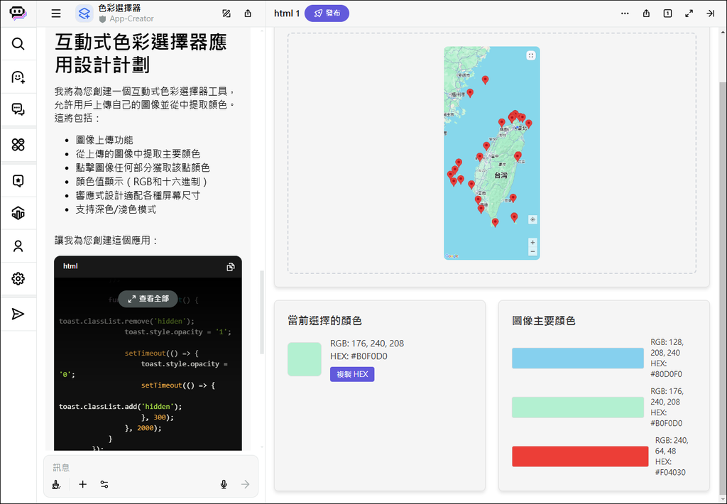 輸入指令:建立一個互動色彩選擇器工具,允許使用者使用自己的圖像。