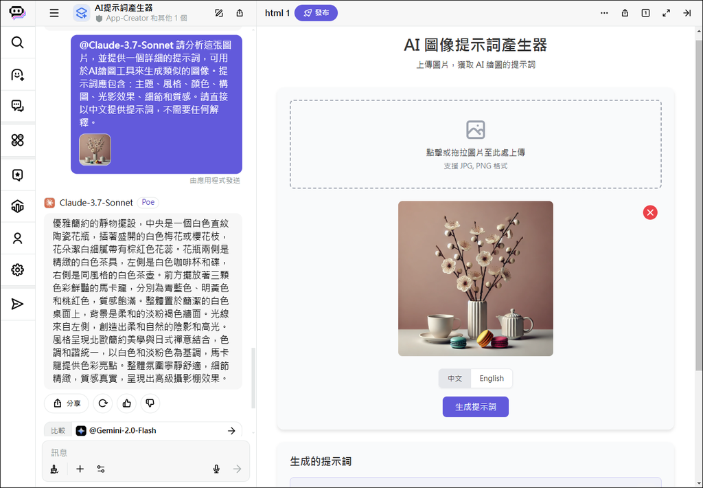 例如,我用 Poe 建立一個「圖像提示詞產生器」,上傳一張圖像後即可回傳繪製這張圖像的提示詞。