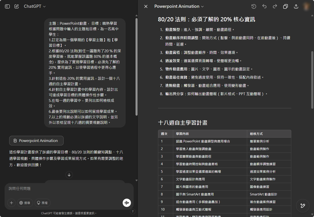 參考以下的做法,先請 ChatGPT 協助學生自主學習規劃的範例提示詞: