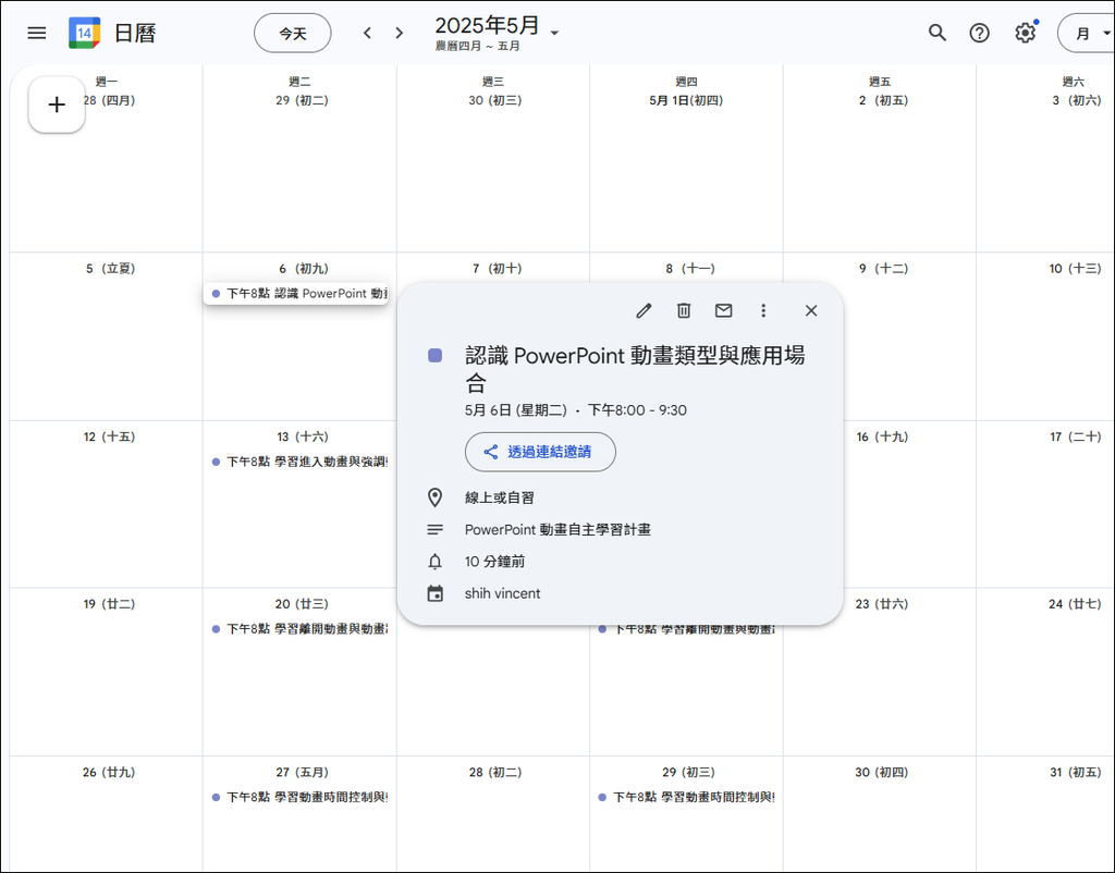18週的星期二和星期四晚上8:00至晚上9:30,共36個的日曆活動已自動建好了,而且也標示了學習內容。