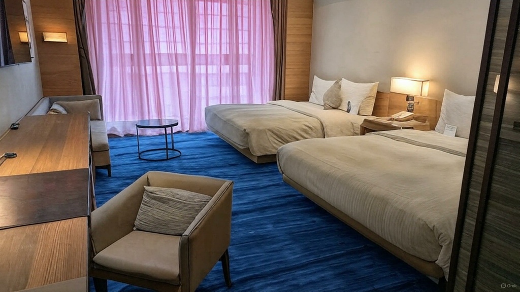 提示詞:換上粉紅色窗簾,桌上的燈改至牆上。地毯換不同質感的色彩。