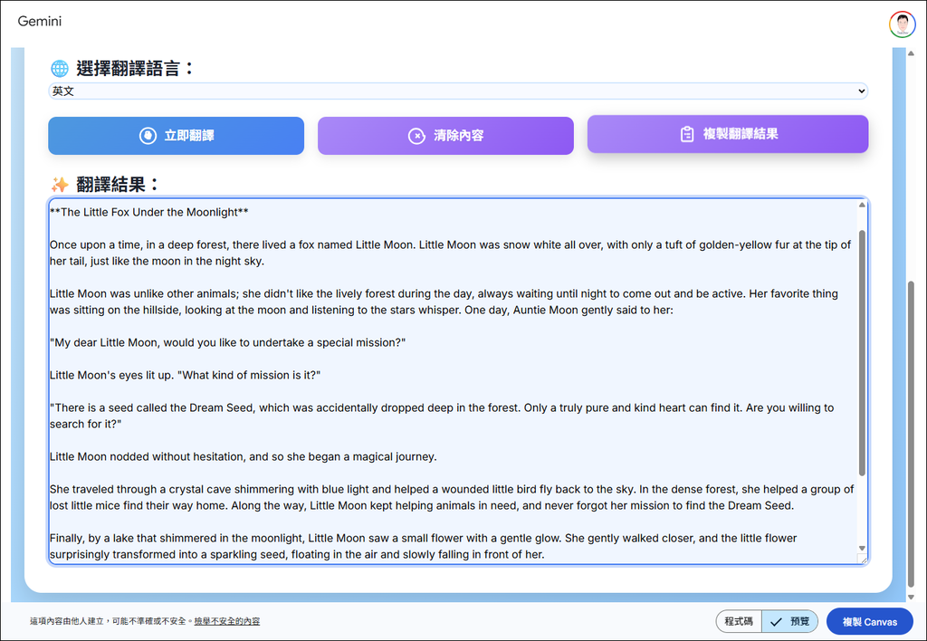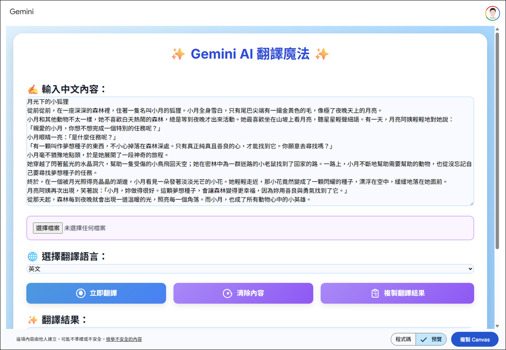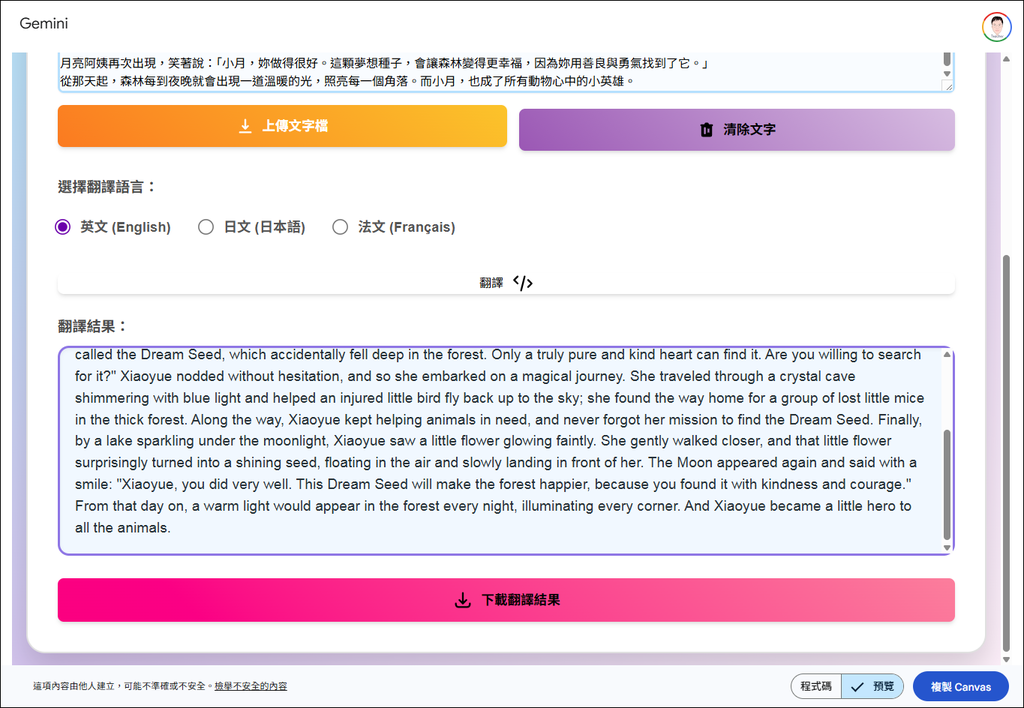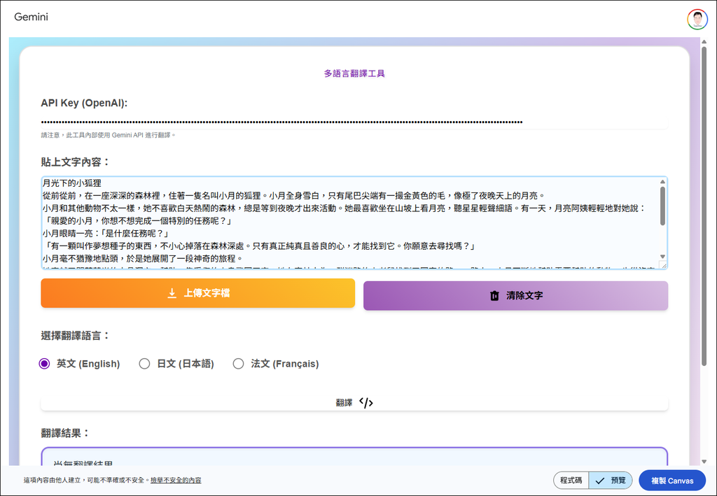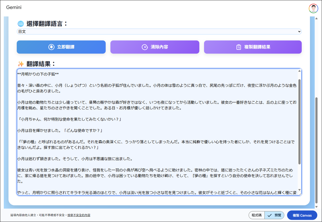 3.由Gemini AI根據文字內容進行翻譯成英文/日文/法文。