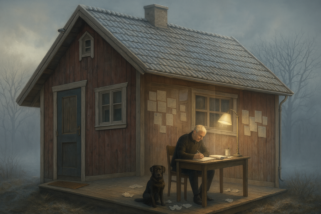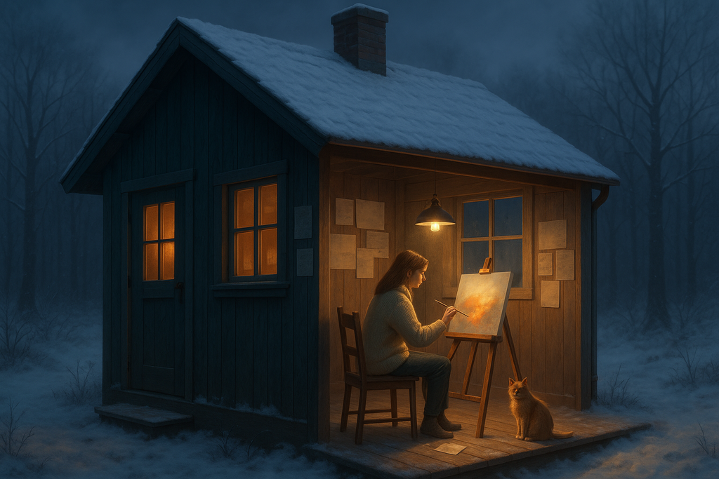 這張新圖把小木屋換成深青色外牆、夜雪的場景,牆面依舊半透明,但改成女孩在畫布前作畫,地上還多了一隻橘貓陪伴。室內暖橘光與室外冷藍雪景對比更強,依然有「人在屋內/屋外」切換視覺效果。