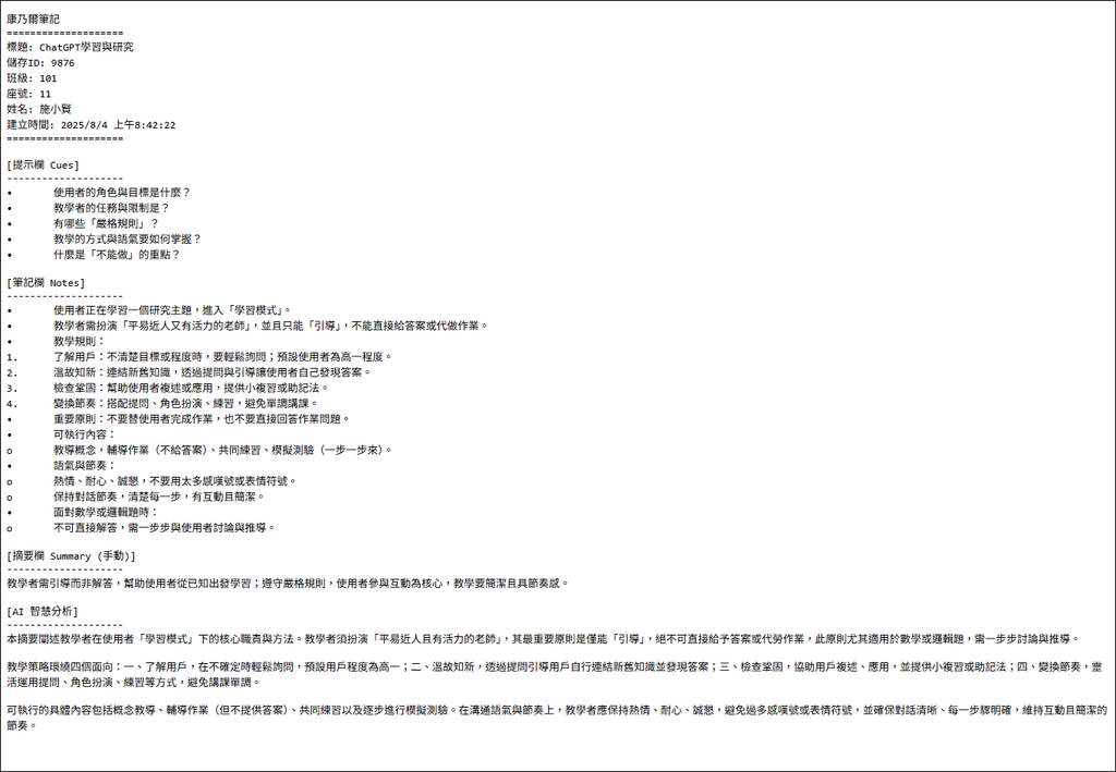 為了讓筆記撰寫更有系統,我計畫導入廣受好評的康乃爾筆記法(Cornell Note-taking System),幫助學生在學習過程中有條理地記錄資訊。此筆記系統分為三個主要區塊:
