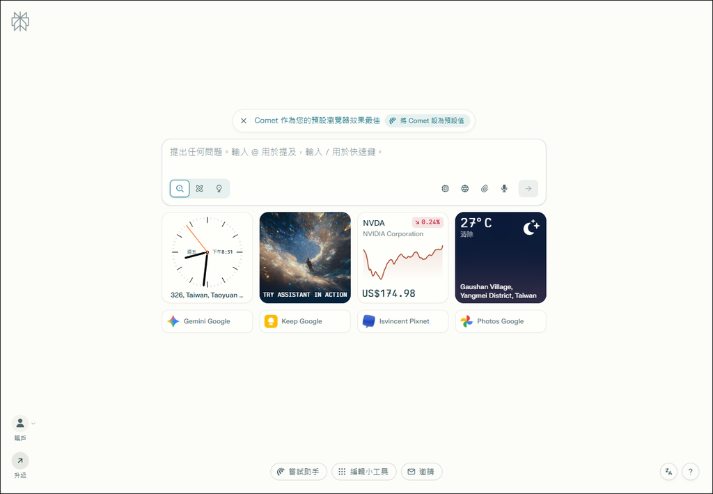 以下來操作看看。這是在 Comet 的預設首頁:(登入 Perplexity)