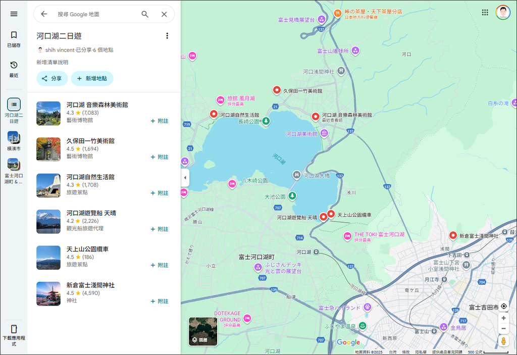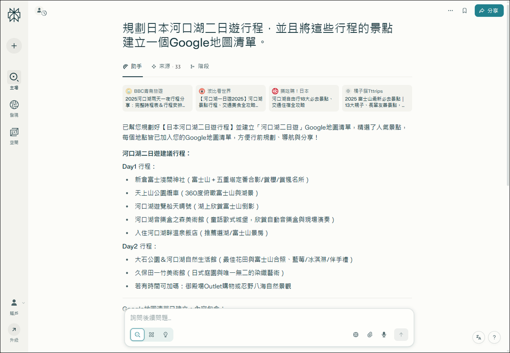 再來試一個和 Google 地圖有關的助手功能,例如,使用以下的提示詞:規劃日本河口湖二日遊行程,並且將這些行程的景點建立一個Google地圖清單。