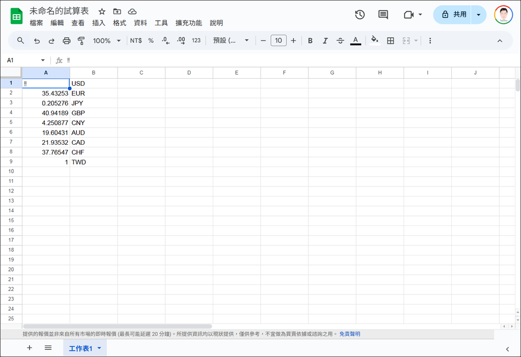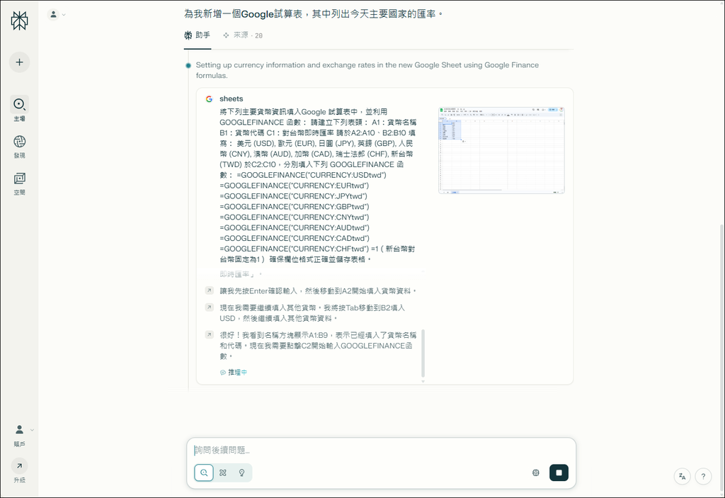 範例:為我新增一個Google試算表,其中列出今天主要國家的匯率。
