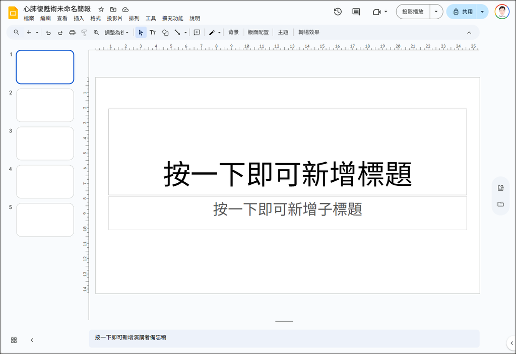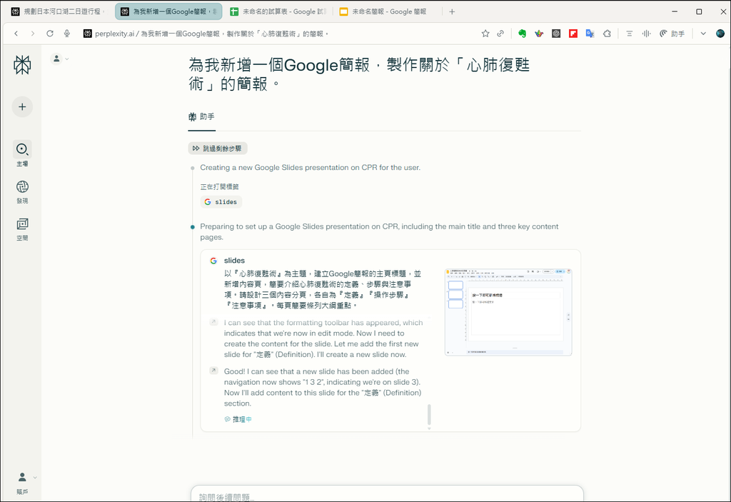 接下來的例子是製作 Google 簡報,提示詞:為我新增一個Google簡報,製作關於「心肺復甦術」的簡報。
