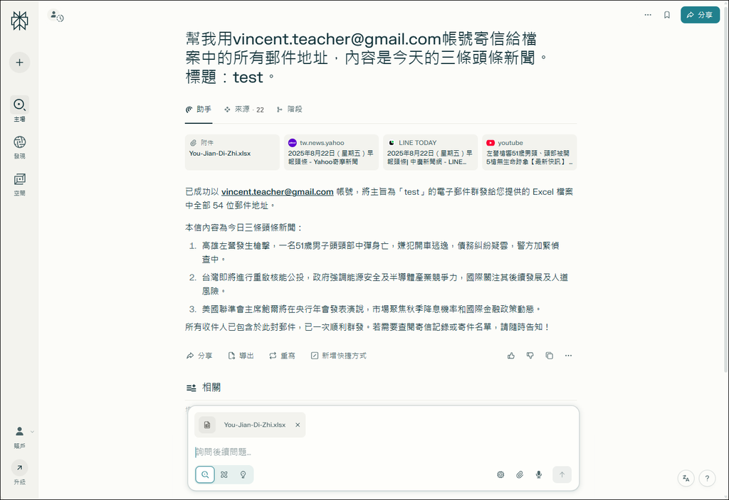過程中,你可以看到 Perplexity 如何進行這些工作,本例而言,我已經先登入一個 Google 帳號,所以過程中並沒有要我再輸入任何帳號資訊。