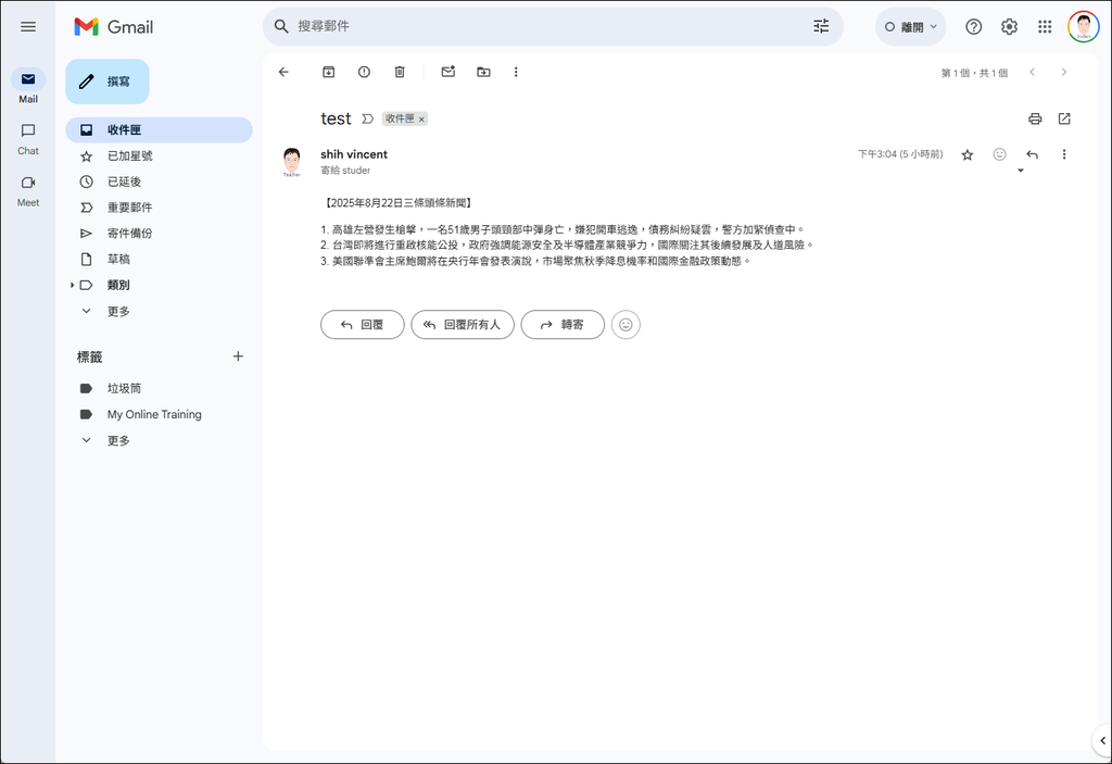 幫我用vincent.XXXX@gmail.com帳號寄信給檔案中的所有郵件地址,內容是今天的三條頭條新聞。標題:test。