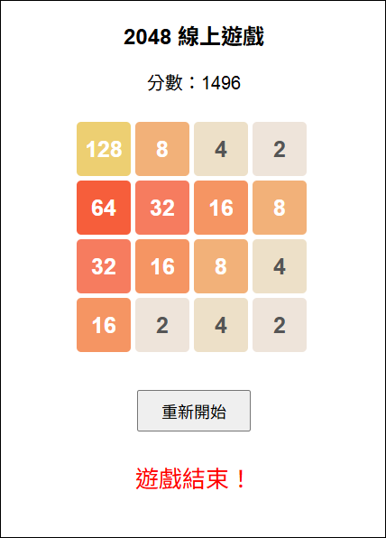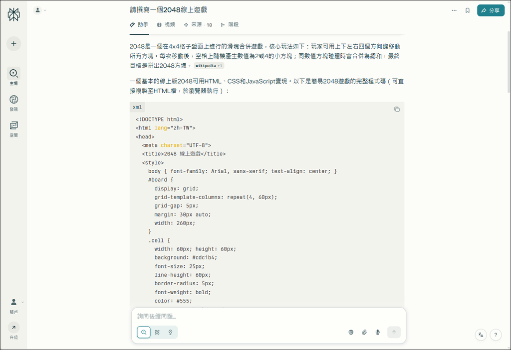 接著,請 Perplexity 撰寫遊戲程式,提示詞:請撰寫一個2048線上遊戲。